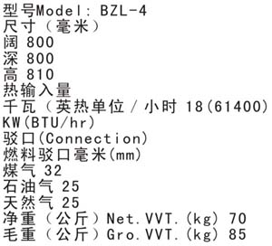 產品簡介:四頭煲仔爐參數型號:BZL-4長深高(mm):800 800 810風機:E2熱輸入量(千瓦/小時):18KW煤氣:32石油氣:25天然氣:25凈重(公斤):70KG毛重(公斤):85KG